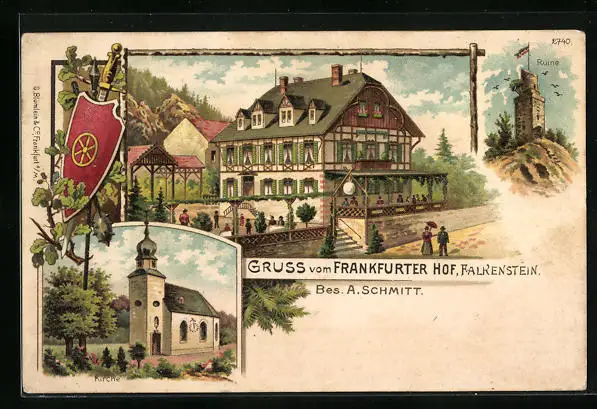 Lithographie Falkenstein, Gasthaus Frankfurter Hof mit Kirche