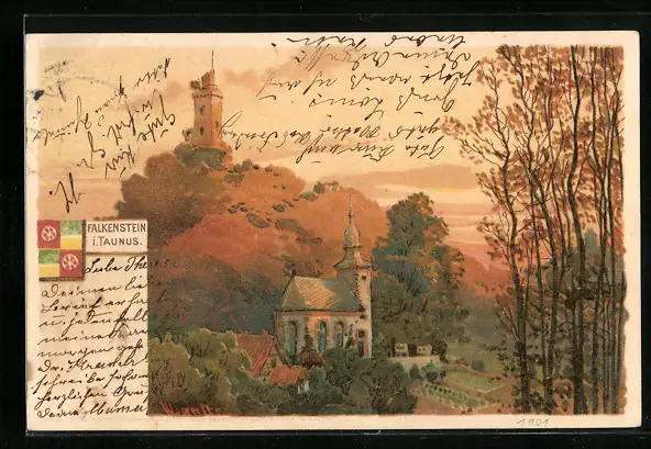 Lithographie Falkenstein i. Taunus, Ortspartie mit Kirche