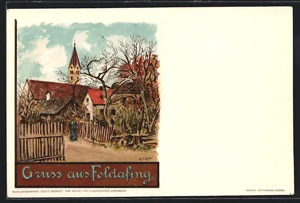 Lithographie Feldafing, Häuserpartie an der Kirche