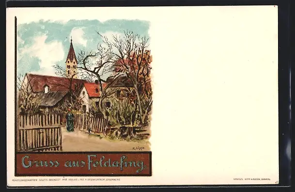 Lithographie Feldafing, Häuserpartie an der Kirche