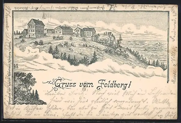 Lithographie Feldberg / Taunus, Panorama mit Wanderern und Berghütten