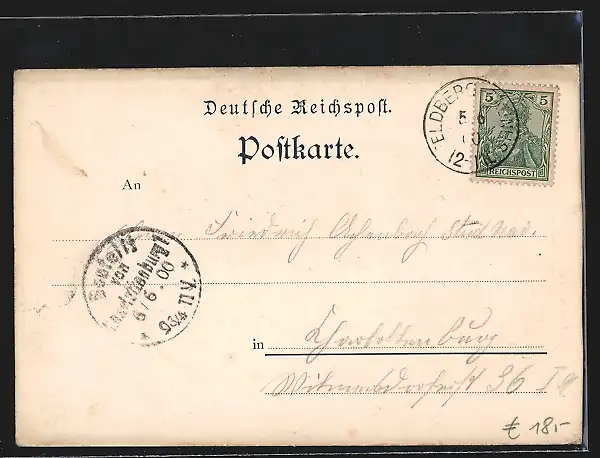 Personenbezogene Daten auf der Rückseite der Karte wurden durch blauen Textmarker unkenntlich gemacht. Die blauen Stellen sind auf die Vorderseite durchgeweicht und wirken sich negativ auf das Postkartenfoto aus
