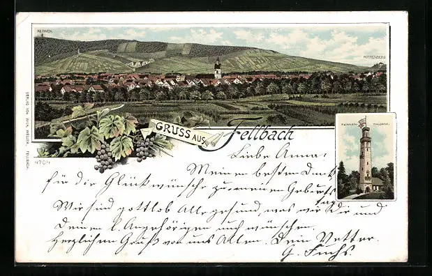 Lithographie Fellbach, Gesamtansicht, Kernenthurm