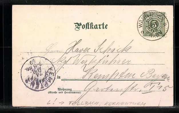 Personenbezogene Daten auf der Rückseite der Karte wurden durch blauen Textmarker unkenntlich gemacht. Die blauen Stellen sind auf die Vorderseite durchgeweicht und wirken sich negativ auf das Postkartenfoto aus
