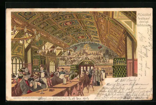 Lithographie Festsaal des Münchner Hofbräuhauses