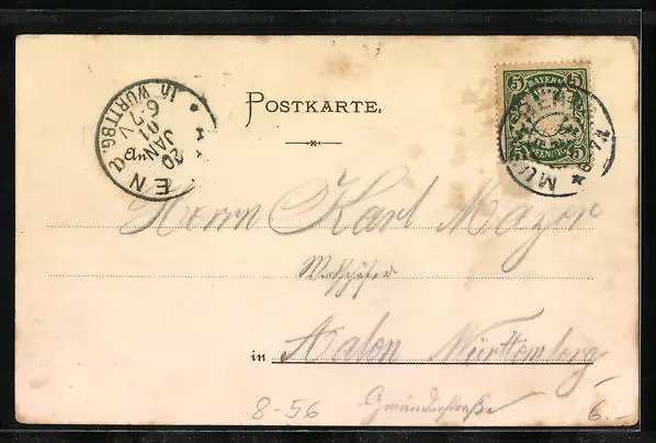 Personenbezogene Daten auf der Rückseite der Karte wurden durch blauen Textmarker unkenntlich gemacht. Die blauen Stellen sind auf die Vorderseite durchgeweicht und wirken sich negativ auf das Postkartenfoto aus