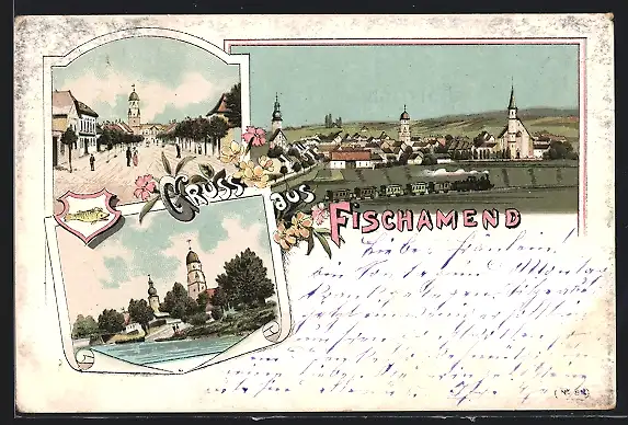 Lithographie Fischamend, Strassenpartie, Eisenbahn vor dem Ort