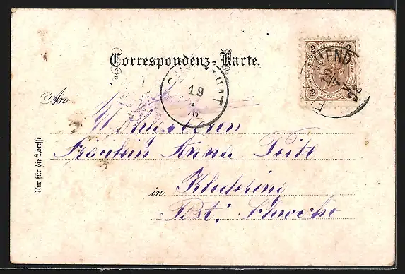 Personenbezogene Daten auf der Rückseite der Karte wurden durch blauen Textmarker unkenntlich gemacht. Die blauen Stellen sind auf die Vorderseite durchgeweicht und wirken sich negativ auf das Postkartenfoto aus