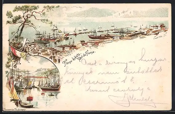 Lithographie Fiume, Port, Hafenansicht und Segelboote