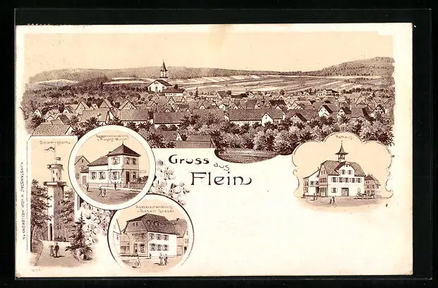 Lithographie Flein, Geschäfte August Wurst und Robert Grauer, Rathaus, Schweinsturm