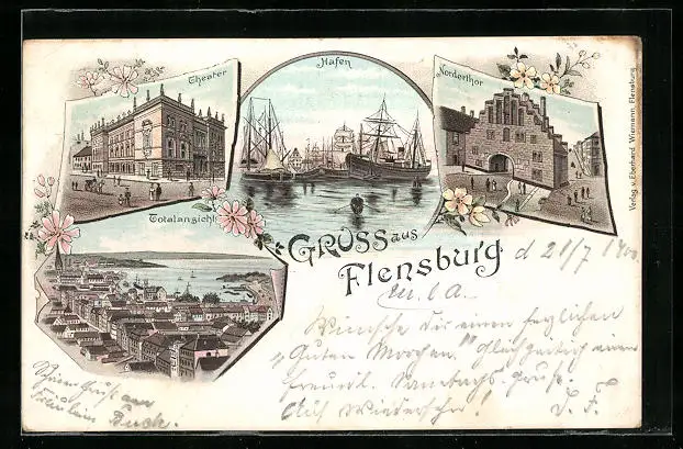 Lithographie Flensburg, Hafen, Theater, Nordertor