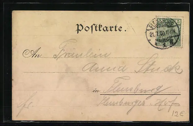Personenbezogene Daten auf der Rückseite der Karte wurden durch blauen Textmarker unkenntlich gemacht. Die blauen Stellen sind auf die Vorderseite durchgeweicht und wirken sich negativ auf das Postkartenfoto aus