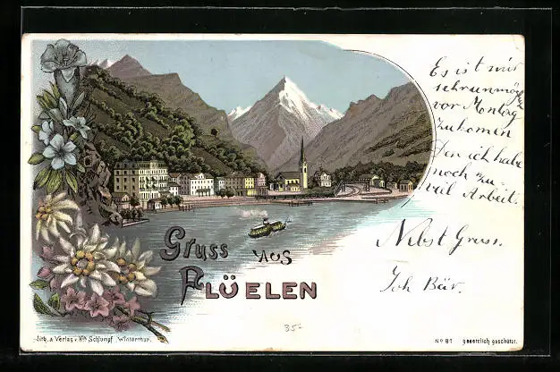 Lithographie Flüelen, Ortsansicht am Wasser mit Berggipfeln