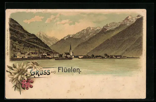 Lithographie Flüelen, Teilansicht mit Gewässer und Bergen