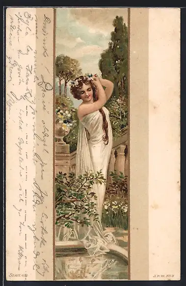 Lithographie Fräulein steckt sich eine Blüte ins Haar, Jugendstil