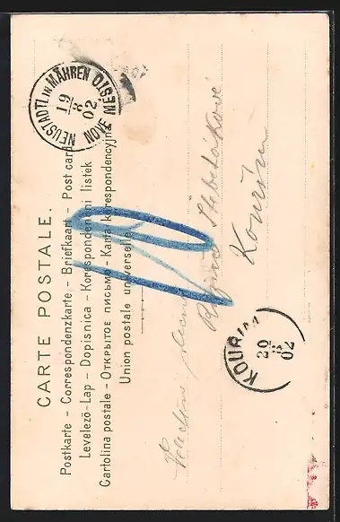 Personenbezogene Daten auf der Rückseite der Karte wurden durch blauen Textmarker unkenntlich gemacht. Die blauen Stellen sind auf die Vorderseite durchgeweicht und wirken sich negativ auf das Postkartenfoto aus