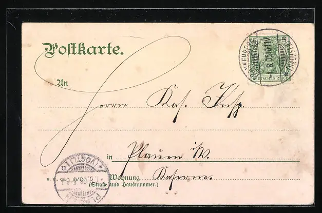Personenbezogene Daten auf der Rückseite der Karte wurden durch blauen Textmarker unkenntlich gemacht. Die blauen Stellen sind auf die Vorderseite durchgeweicht und wirken sich negativ auf das Postkartenfoto aus