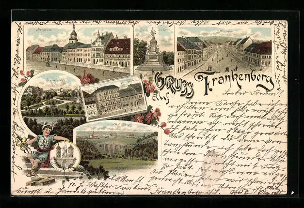 Lithographie Frankenberg i. Sa., Marktplatz und Schlossstrasse