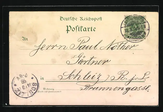 Personenbezogene Daten auf der Rückseite der Karte wurden durch blauen Textmarker unkenntlich gemacht. Die blauen Stellen sind auf die Vorderseite durchgeweicht und wirken sich negativ auf das Postkartenfoto aus