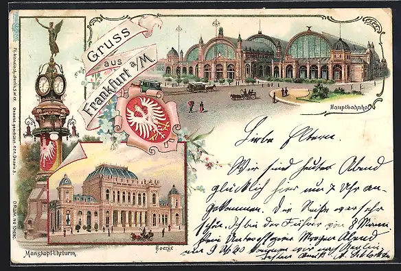 Lithographie Frankfurt /Main, Hauptbahnhof und Börse