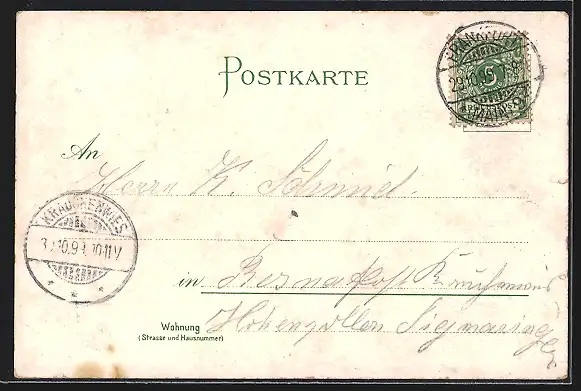 gelaufen 1899, Eckknicke oben, minimaler Einriss li. mittig, guter Zustand