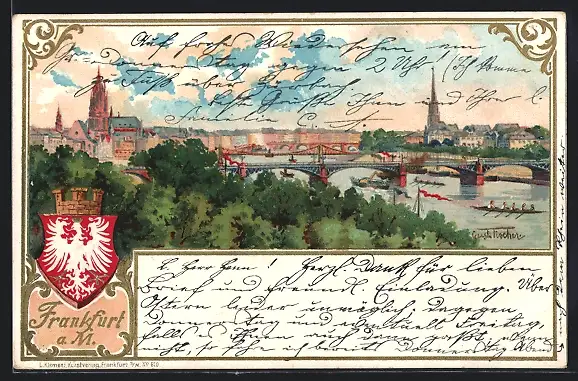 Lithographie Frankfurt, Partie am Main mit Prägewappen