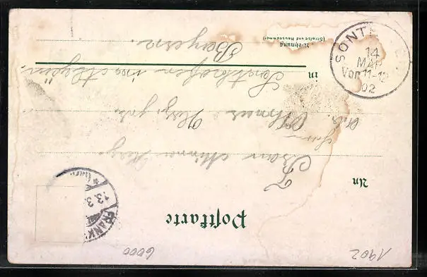 gelaufen 1902, Briefmarke entfernt, Eckknick li. oben, Stempelspur, guter Zustand