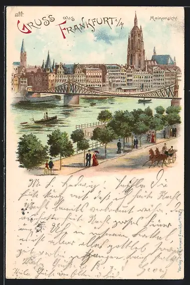Lithographie Frankfurt a. M., Flusspartie mit Brücke