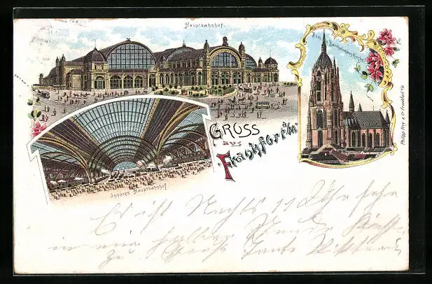 Lithographie Frankfurt a. M., Hauptbahnhof, Inneres, Dom u. Bartholomäus-Kirche
