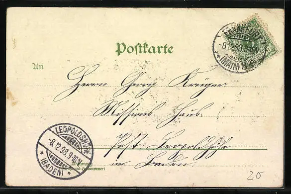 Personenbezogene Daten auf der Rückseite der Karte wurden durch blauen Textmarker unkenntlich gemacht. Die blauen Stellen sind auf die Vorderseite durchgeweicht und wirken sich negativ auf das Postkartenfoto aus