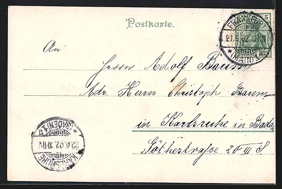 Personenbezogene Daten auf der Rückseite der Karte wurden durch blauen Textmarker unkenntlich gemacht. Die blauen Stellen sind auf die Vorderseite durchgeweicht und wirken sich negativ auf das Postkartenfoto aus