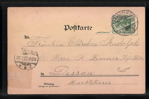 gelaufen 1902, Einriss re. unten, rückseitig Klebe- und Papierreste, guter Zustand