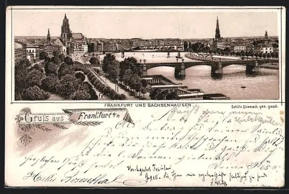 Lithographie Frankfurt a. M., Teilansicht mit Sachsenhausen