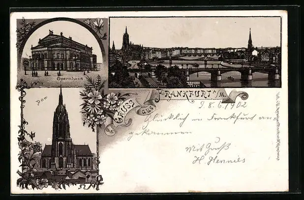 Lithographie Frankfurt a. M., Totalansicht, Opernhaus, Dom