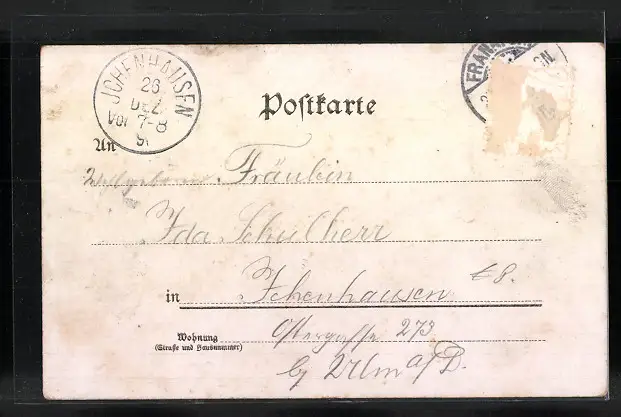 Personenbezogene Daten auf der Rückseite der Karte wurden durch blauen Textmarker unkenntlich gemacht. Die blauen Stellen sind auf die Vorderseite durchgeweicht und wirken sich negativ auf das Postkartenfoto aus