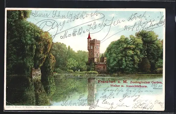 Lithographie Frankfurt a. M., Zoologischer Garten: Weiher mit Aussichtsturm