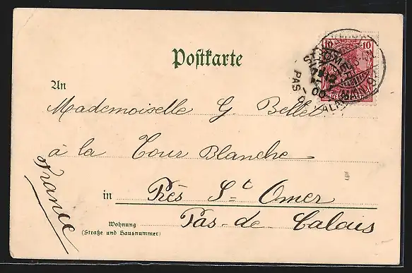 Personenbezogene Daten auf der Rückseite der Karte wurden durch blauen Textmarker unkenntlich gemacht. Die blauen Stellen sind auf die Vorderseite durchgeweicht und wirken sich negativ auf das Postkartenfoto aus