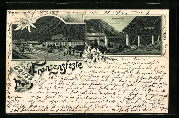 Lithographie Franzensfeste, Bahnhof mit Stationsgebäude, Hohe Brücke