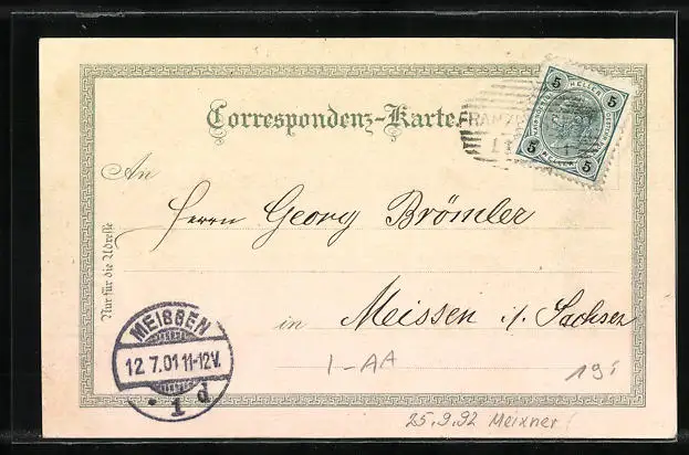 Personenbezogene Daten auf der Rückseite der Karte wurden durch blauen Textmarker unkenntlich gemacht. Die blauen Stellen sind auf die Vorderseite durchgeweicht und wirken sich negativ auf das Postkartenfoto aus
