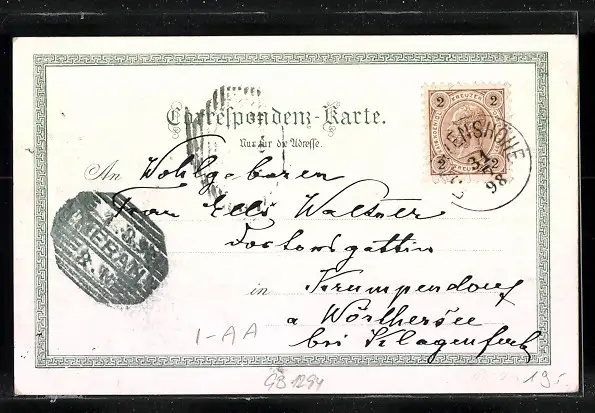 Personenbezogene Daten auf der Rückseite der Karte wurden durch blauen Textmarker unkenntlich gemacht. Die blauen Stellen sind auf die Vorderseite durchgeweicht und wirken sich negativ auf das Postkartenfoto aus