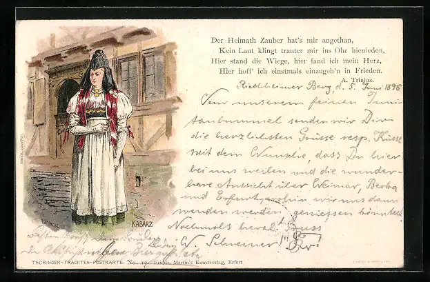 Lithographie Frau im thüring. Trachtenkleid vor einem Haus stehend