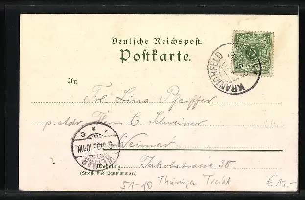 Personenbezogene Daten auf der Rückseite der Karte wurden durch blauen Textmarker unkenntlich gemacht. Die blauen Stellen sind auf die Vorderseite durchgeweicht und wirken sich negativ auf das Postkartenfoto aus