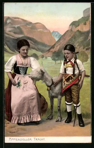 Lithographie Frau und Junge in Appenzeller Tracht mit Ziege