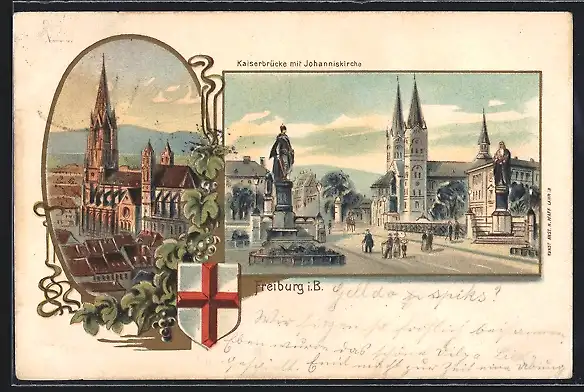 Lithographie Freiburg /B., Kaiserbrücke und Johanniskirche
