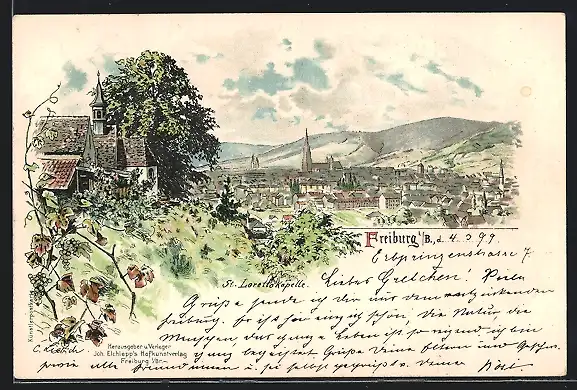 Lithographie Freiburg / Breisgau, St.Loretto Kapelle und Ortsansicht