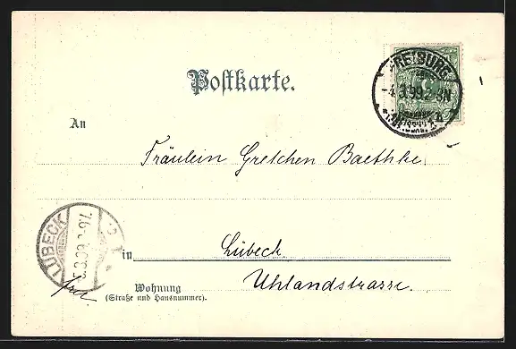 Personenbezogene Daten auf der Rückseite der Karte wurden durch blauen Textmarker unkenntlich gemacht. Die blauen Stellen sind auf die Vorderseite durchgeweicht und wirken sich negativ auf das Postkartenfoto aus