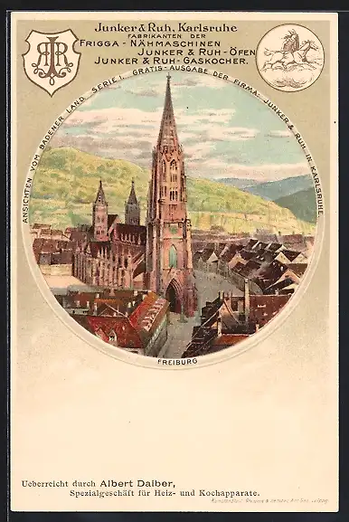Lithographie Freiburg / Breisgau, Teilansicht mit Kirche