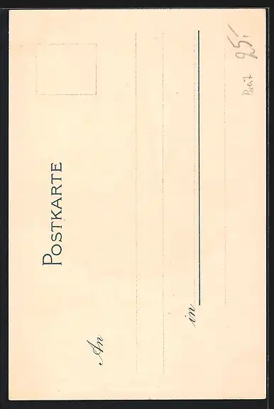 Personenbezogene Daten auf der Rückseite der Karte wurden durch blauen Textmarker unkenntlich gemacht. Die blauen Stellen sind auf die Vorderseite durchgeweicht und wirken sich negativ auf das Postkartenfoto aus