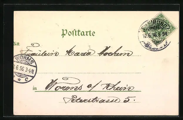 Personenbezogene Daten auf der Rückseite der Karte wurden durch blauen Textmarker unkenntlich gemacht. Die blauen Stellen sind auf die Vorderseite durchgeweicht und wirken sich negativ auf das Postkartenfoto aus