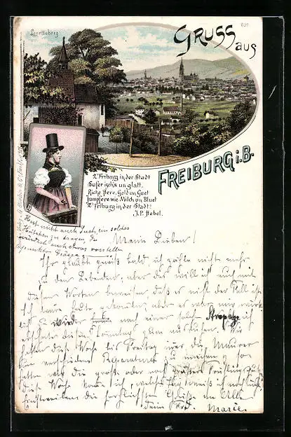 Lithographie Freiburg i. B., Gesamtansicht vom Lorettoberg aus, Freiburgerin in Tracht